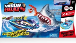 Micro Boat Shark Attack de la ZURU oferă distracție plină de adrenalină cu bărci tehnologice avansate. Asamblați o pistă în formă de opt, umpleți-o cu apă și lăsați barca să se rotească automat și să reacționeze la obstacole.