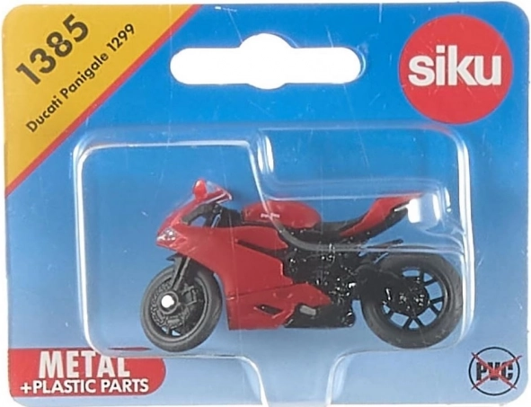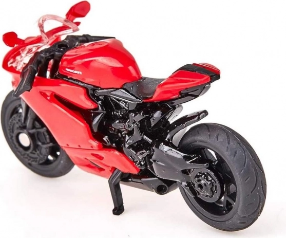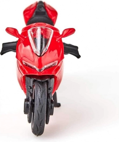 Motocicleta iconică Ducati Panigale 1299, în versiune de model realizată cu precizie de SIKU, va încânta orice pasionat de mașini rapide. Caroserie metalică din zinc turnat sub presiune, prelucrare detaliată, roată față direcționabilă și cric rabatabil – toate în caracteristica culoare roșie.