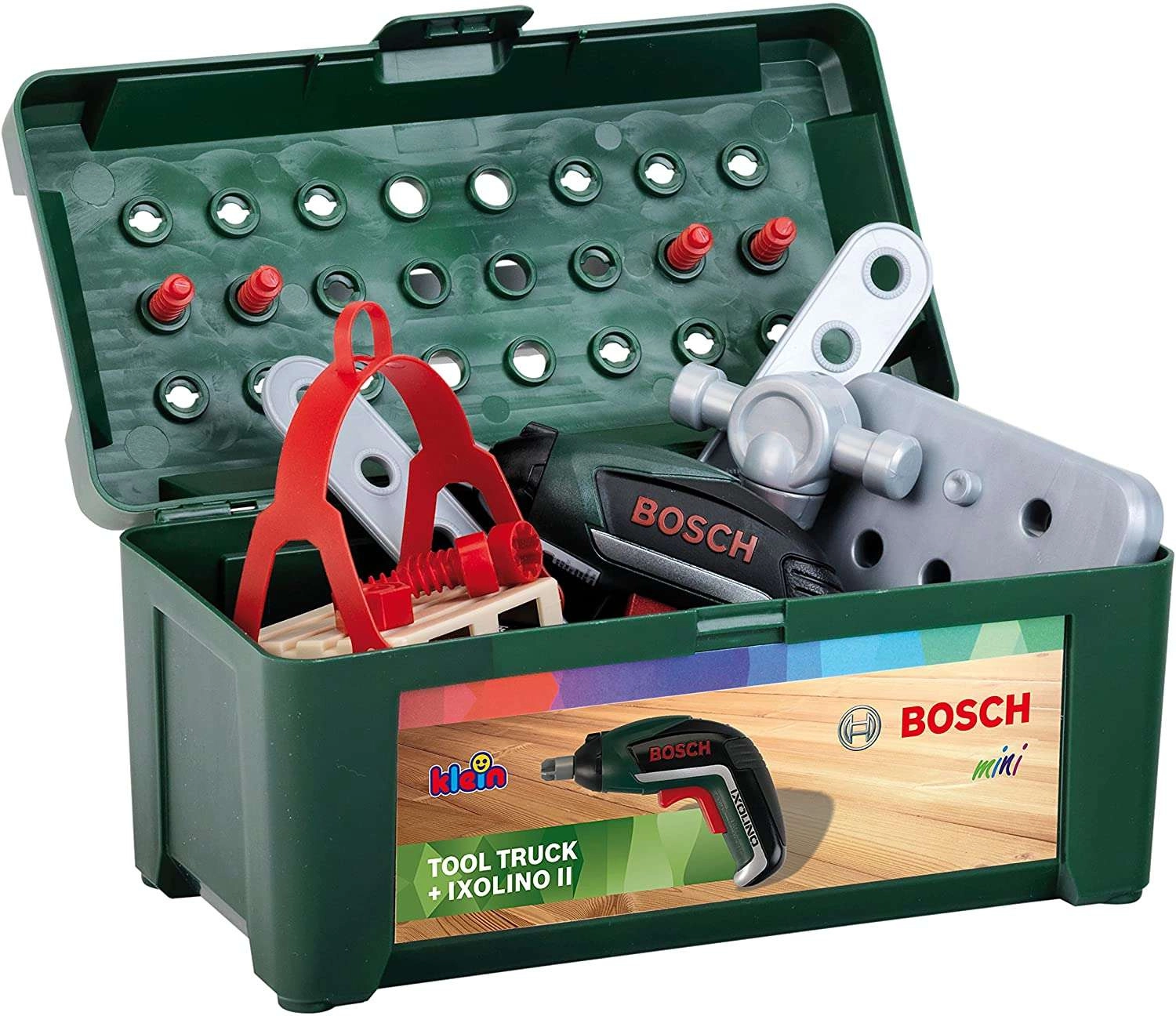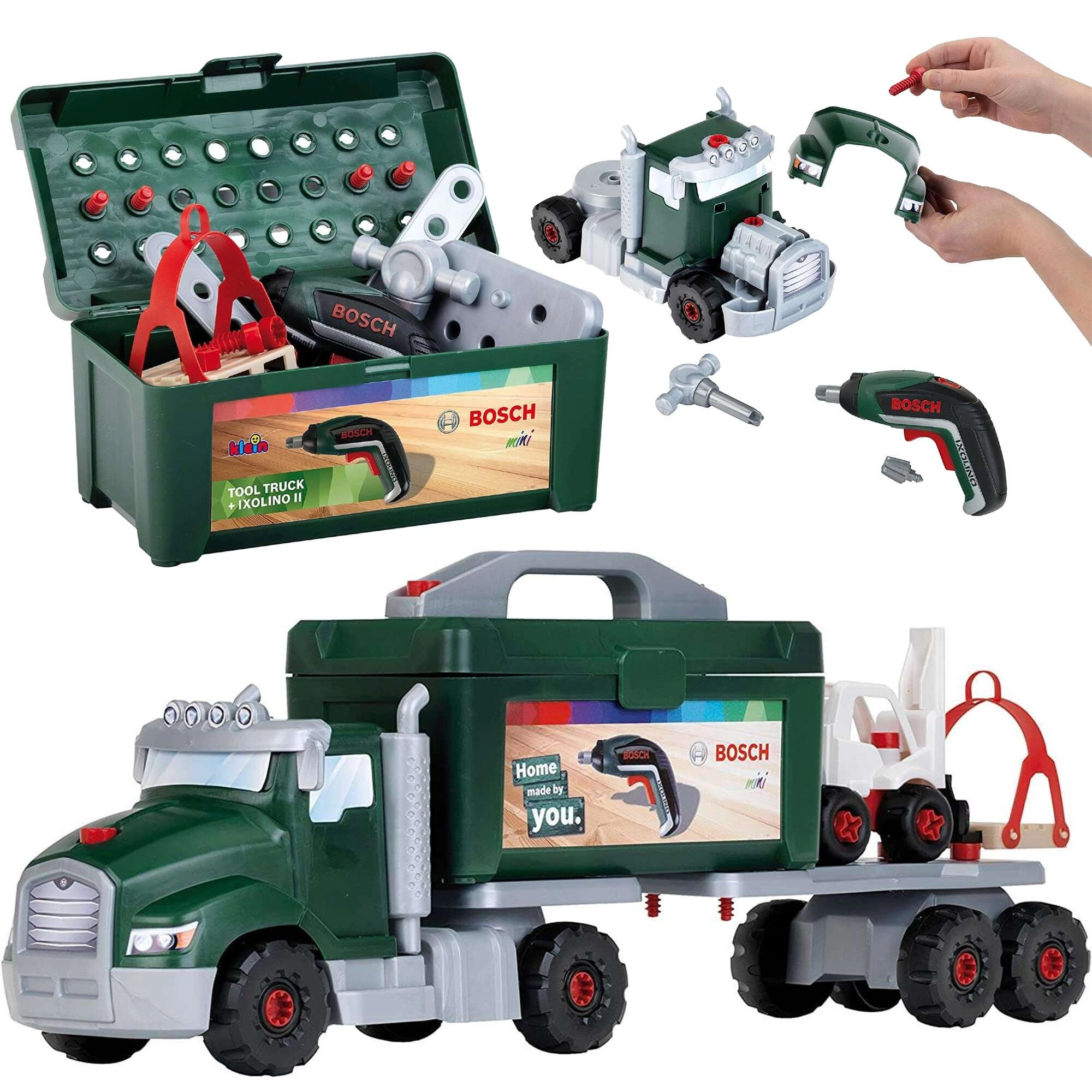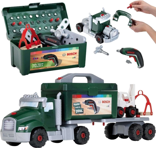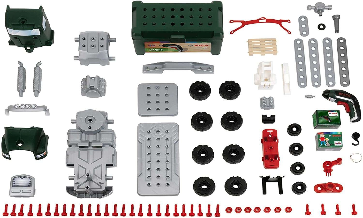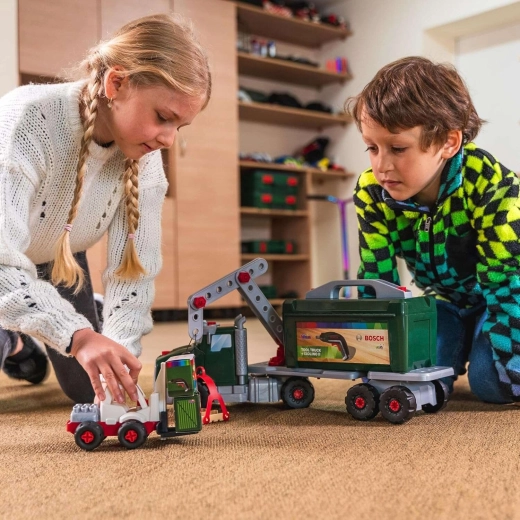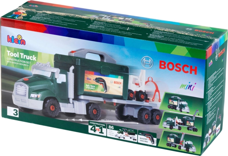 Set de construcție pentru copii camion cu șuruburi BOSCH de la Klein oferă posibilități de joacă aproape nelimitate. Pachetul conține 86 de piese, inclusiv un box detașabil pentru unelte, remorcă, macara, bormașină și un mic stivuitor. Copiii își exersează îndemânarea, logica și imaginația, iar datorită execuției robuste setul va rezista ani de distracție.