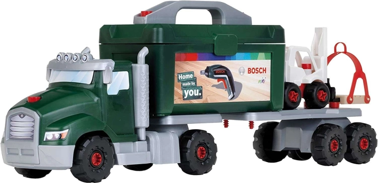 Setul include camion cu remorcă, macara, stivuitor cu palet și un set de șuruburi și piese pentru construcții variabile. Plastic de calitate, detalii atent realizate și roți care rulează lin susțin jocul creativ și de rol acasă și în deplasare.