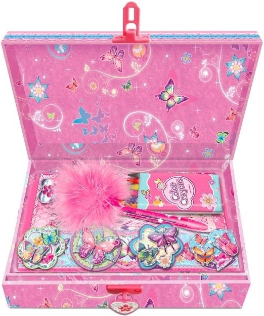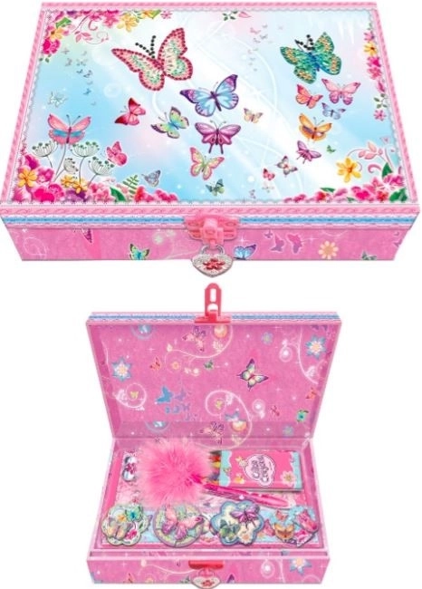 Setul cu jurnal Pecoware cu motiv de fluturi este împachetat într-o cutie decorativă și se închide cu un mic lacăt, ceea ce este ideal pentru a păstra secretele dumneavoastră în siguranță.