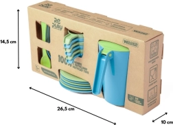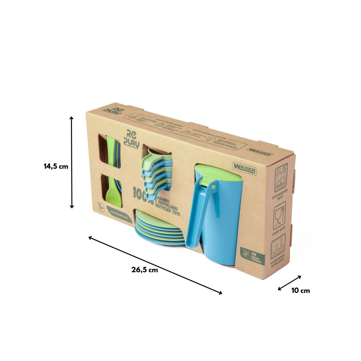Setul include 19 piese: 1 ceainic, 6 cești, 6 farfuriuțe și 6 lingurițe. Vesela este ușoară, rezistentă și ușor de întreținut – o puteți spăla în mașina de spălat vase și încălzi în cuptorul cu microunde. Culoarea materialului reciclat poate varia ușor între loturi (de la nuanțe mai deschise la mai intense), conferind fiecărui set un caracter unic.
