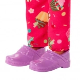 Păpușa Barbie poartă o jachetă albă de bucătar cu detalii roz și o șapcă de bucătar, ceea ce o ajută în rolul de cofetar.