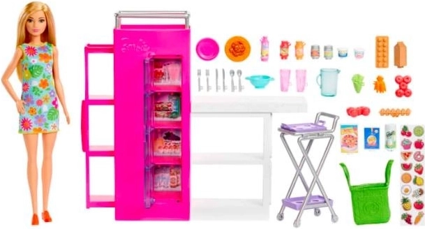 Acest set include peste 30 de accesorii diferite, inclusiv ouă, legume și alimente, pentru o personalizare și un joc creativ. Fie că pregătiți cina sau faceți cumpărături, Barbie este pregătită pentru orice în fusta ei cu flori și cu geanta de cumpărături.