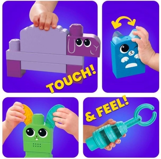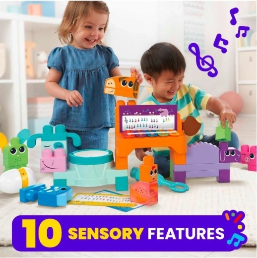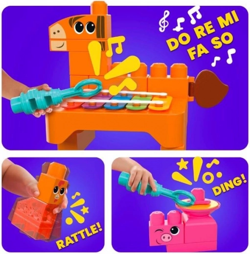 Descoperiți magia construcțiilor cu cuburile Mega Bloks, care încurajează dezvoltarea senzorială a copiilor. Acest set de construcție pentru preșcolari conține 45 de cuburi mari potrivite pentru copiii cu vârsta cuprinsă între 1-3 ani. Animăluțe precum căluțul, văcuța sau puișorul, fiecare dintre ele oferă un element muzical propriu, cum ar fi xilofonul, toba sau maraca. Copiii nu doar că se vor distra, dar vor învăța și să cânte până la 6 melodii, ceea ce le dezvoltă abilitățile motorii și cognitive.