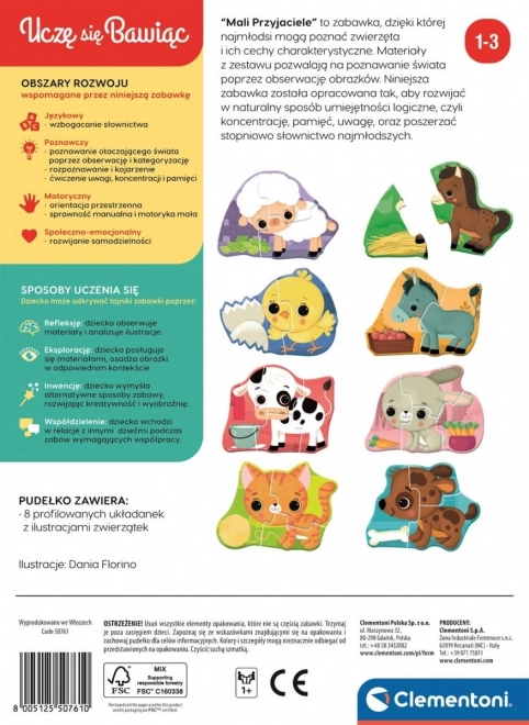 Prieteni Mici este o jucărie prin intermediul căreia cei mai mici pot învăța despre animale și caracteristicile lor. Materialele din set le permit să descopere lumea observând imaginile. Această jucărie a fost concepută pentru a dezvolta în mod natural abilitățile logice, adică concentrarea, memoria, atenția, și pentru a extinde treptat vocabularul celor mici.