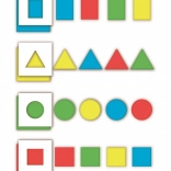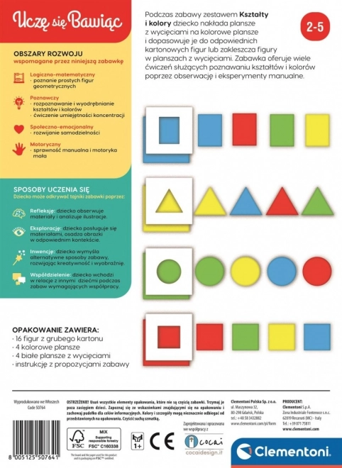 În timpul jocului cu setul Forme și culori, copilul așază decupajele pe plăcile colorate și le potrivește cu figurinele din carton corespunzătoare sau introduce figurinele în decupaje. Jucăria oferă multe sarcini pentru învățarea formelor și culorilor prin observare și experimentare practică.