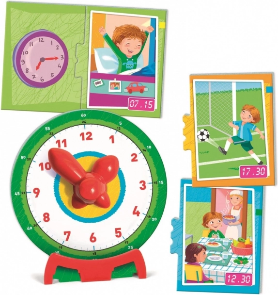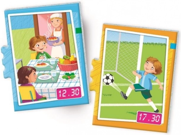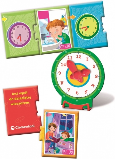 O jucărie fantastică ce te învață într-un mod distractiv să folosești ceasul. În timpul jocului cu piesele de puzzle și cu ceasul mare inclus în set, copiii exersează asocierea orelor în format analogic și digital cu activitățile cotidiene. Pe partea din spate a fiecărei piese găsesc, de asemenea, descrierea activității și cel mai corect mod de a exprima ora în cuvinte.
