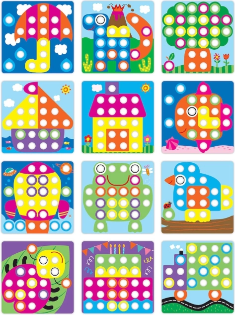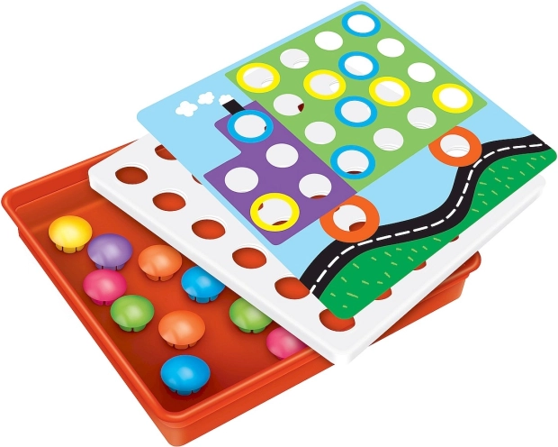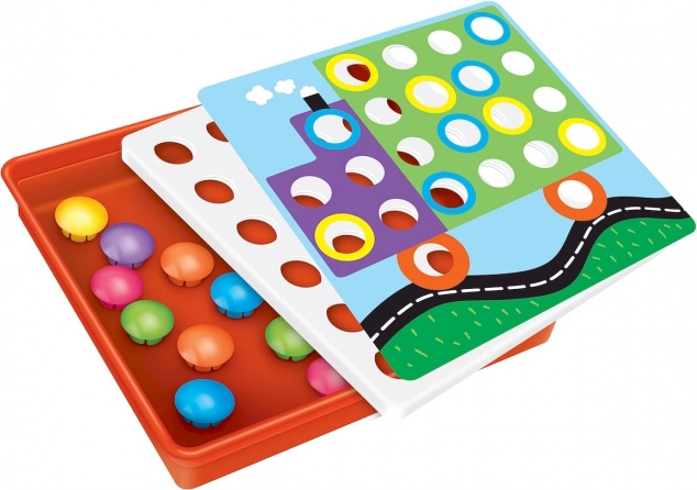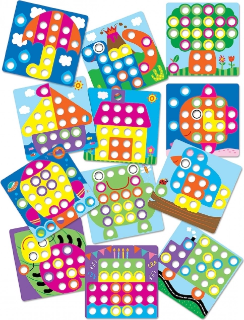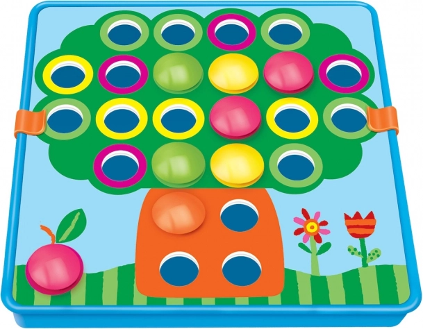 Începeți jocul îndepărtând folia transparentă și scoțând formele circulare colorate. Alegeți un card, așezați-l sub folia de acoperire și începeți să plasați piesele rotunde în locurile corecte.