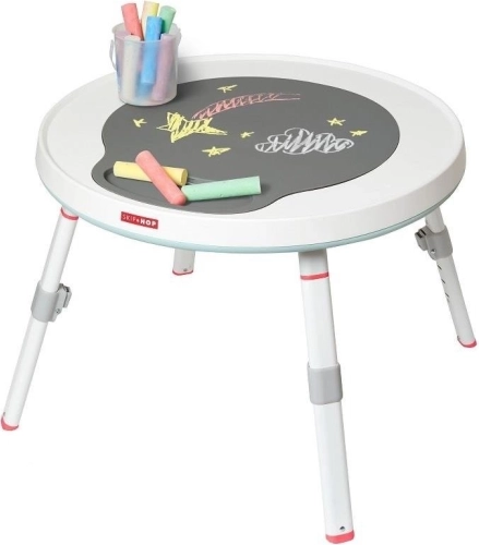 Din centru de activități se transformă ușor în masă de joacă interactivă, iar mai târziu într-o masă robustă cu suprafață tip tablă pentru desen și jocuri creative.
