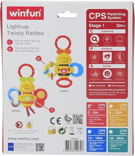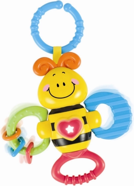 Această albinuță colorată este o primă jucărie grozavă pentru cei mici. La scuturare emite un zornăit plăcut, iar la apăsarea butonului central se activează melodiile și luminița clipitoare, care stimulează curiozitatea și percepția senzorială. Forma ergonomică și multiplele inele pentru prindere facilitează ținerea în mânuțele mici.