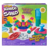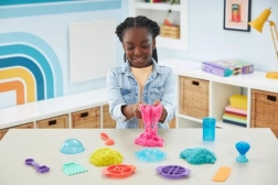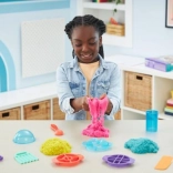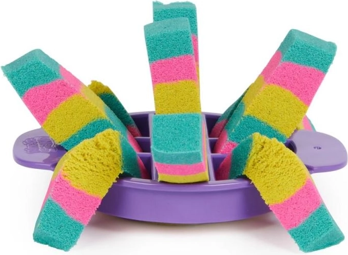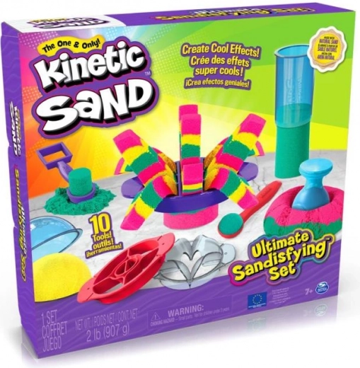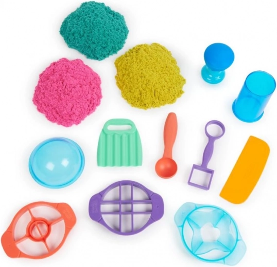 Setul ultim pentru iubitorii de nisip cinetic aduce 900 g de nisip în trei culori (roz, galben, turcoaz) și 10 instrumente practice, inclusiv 3 unelte exclusive de tăiere pentru efecte impresionante. Copiii pot amesteca, stratifica, tăia, presa și modela nisipul după imaginație – joaca este captivantă, relaxantă și sigură.