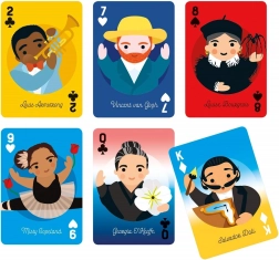 Descoperă cărțile de joc Mudpuppy Micul artist, cu portrete ilustrate color ale unor creatori inspiraționali. Setul conține 52 de cărți + 2 jokeri, este fabricat din 70% hârtie reciclată și tipărit cu cerneuri netoxice. O cutie tip sertar practică asigură depozitarea ușoară. Ideal pentru 2–4 jucători și copii de la 4 ani.