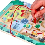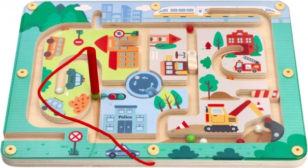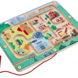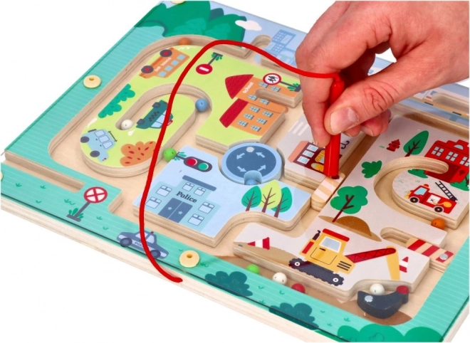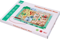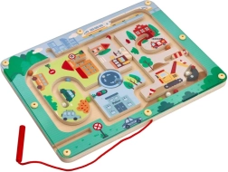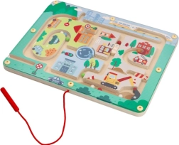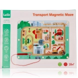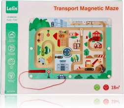 Descoperiți lumea distractivă cu Labirintul magnetic Vehicule, care este conceput pentru a stimula gândirea și îndemânarea micilor mânuțe. Această jucărie este realizată din lemn de calitate și prezintă o scenă urbane colorată cu drumuri, clădiri și vehicule. Cu ajutorul baghetei magnetice roșii, copiii conduc bilele mici de-a lungul traseului, ceea ce susține abilitățile lor manuale și coordonarea mână-ochi.