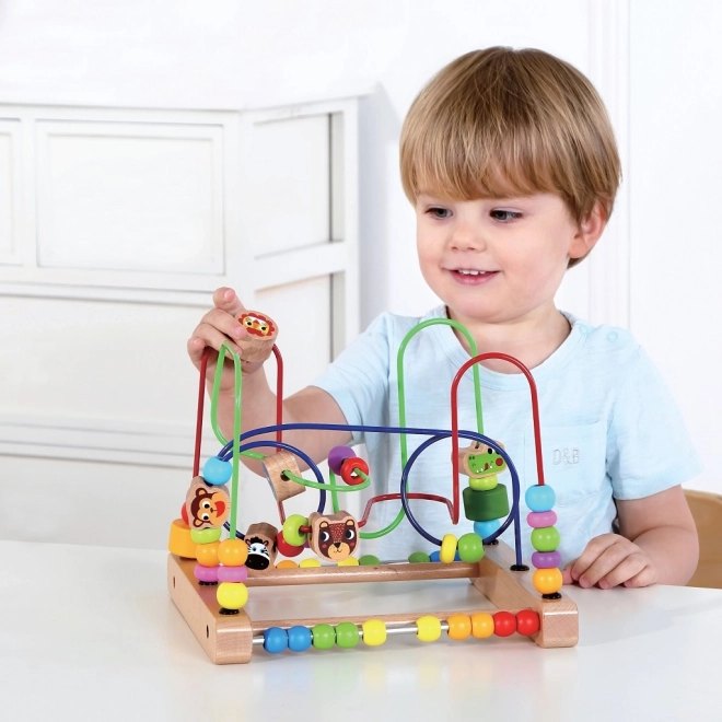Labirintul din lemn cu animale este jucăria ideală pentru micii exploratori de la 18 luni. Datorită mărgelelor colorate și prietenilor animăluțe adorabili, copiii își antrenează într-un mod distractiv coordonarea mână–ochi și învață să recunoască culorile și formele. Jocul cu mărgele susține, de asemenea, primii pași către numărare și dezvoltă în mod natural gândirea logică.