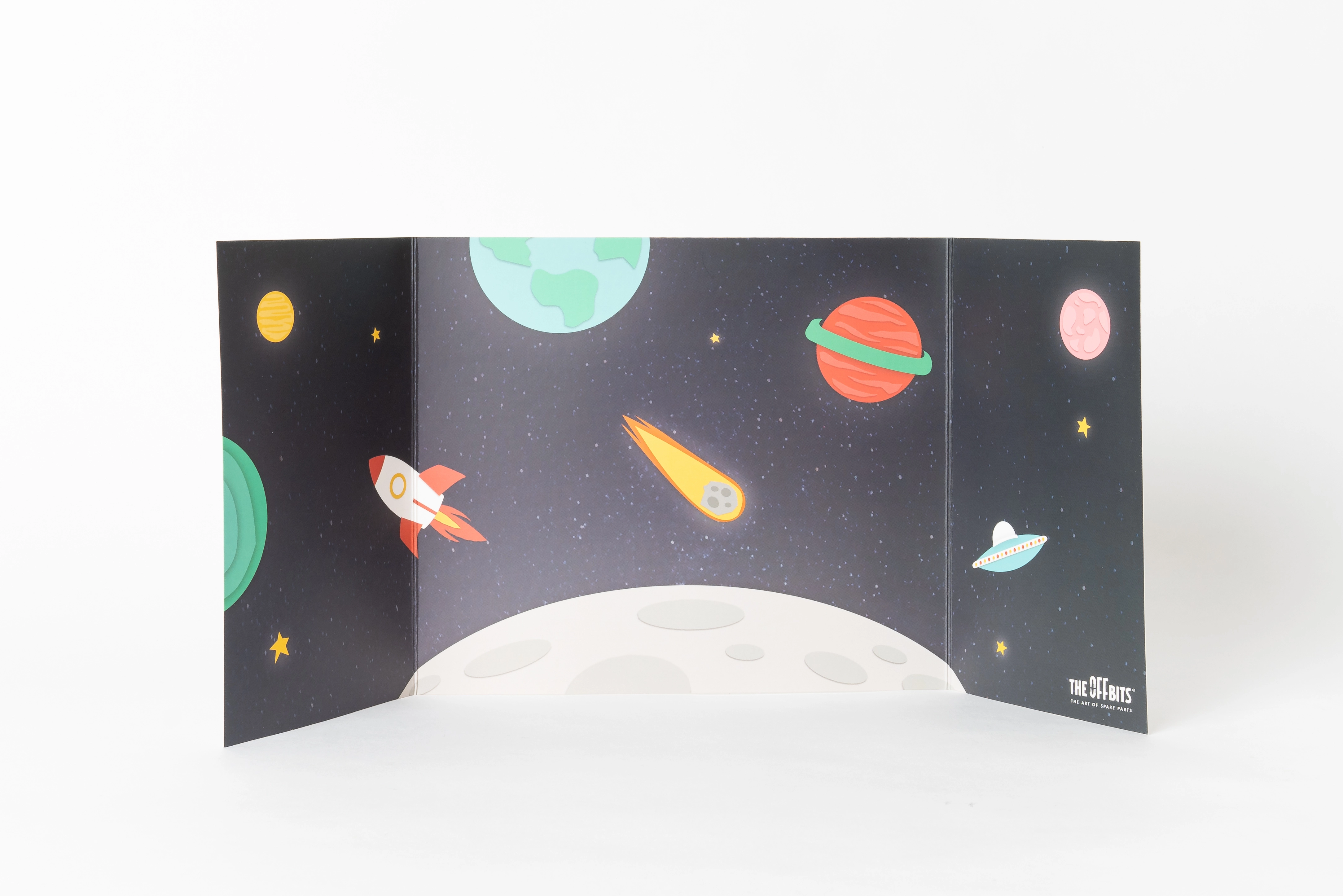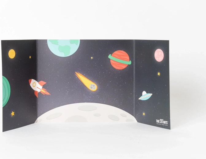 Fundalul pliabil din carton, cu tematică spațială, creează un decor impresionant pentru joacă și fotografierea modelelor finalizate. Construcția stabilă în trei panouri extinde universul de joc.
