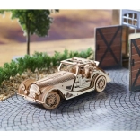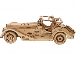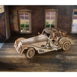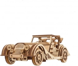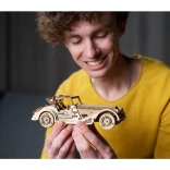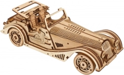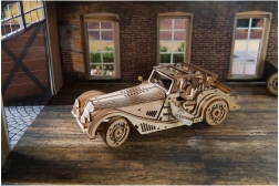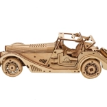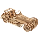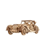 Modelul se remarcă prin interiorul detaliat, ușile laterale care se deschid, acoperiș fix acționat manual cu trapă și roată de rezervă funcțională în portbagaj. Pachetul conține tot ce ai nevoie – piesele sunt predecupate, iar asamblarea se face după ghidul ilustrat în 11 limbi. Poți păstra finisajul natural al lemnului sau îți poți personaliza mașina prin vopsire.