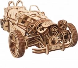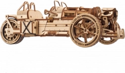 Tricicleta UGEARS UGR‑S combină farmecul auto clasic cu o mecanică ingenioasă. Motorul cu arc și transmisia pe lanț pun în mișcare roata din spate, modelul este complet direcționabil și poate parcurge aproximativ 4 metri în linie dreaptă. Cu comutatorul cutiei de viteze selectezi ușor modurile Park/Drive și, în timpul mersului, vezi în acțiune pistoanele frumos realizate și angrenajele.