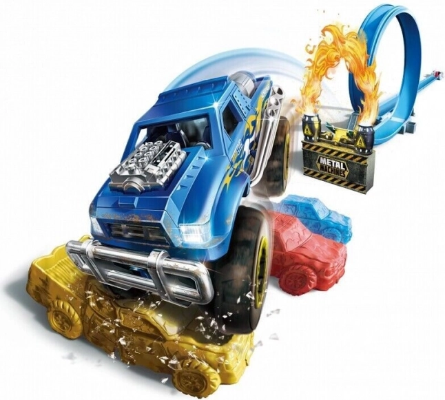 Această pistă de cascadorii este concepută pentru distracție maximă și trucuri palpitante. Lansatorul oferă un impuls puternic, trimițând mașinuța metalică prin buclă și peste rampă, unde execută sărituri îndrăznețe. Ideală pentru fanii vitezei și ai jocului creativ.