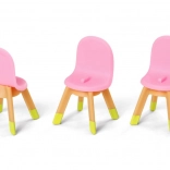 Scăunelele au șezuturi roz și picioare ușoare din lemn cu capete galben neon, perfecte pentru copii.