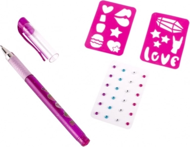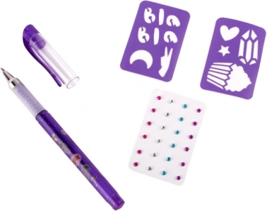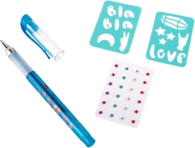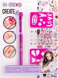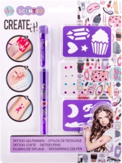 Set de tatuaje cu pix gel parfumat – setul conține un pix gel parfumat pentru tatuaje – 3 culori diferite, pietricele autoadezive sclipitoare și două șabloane.