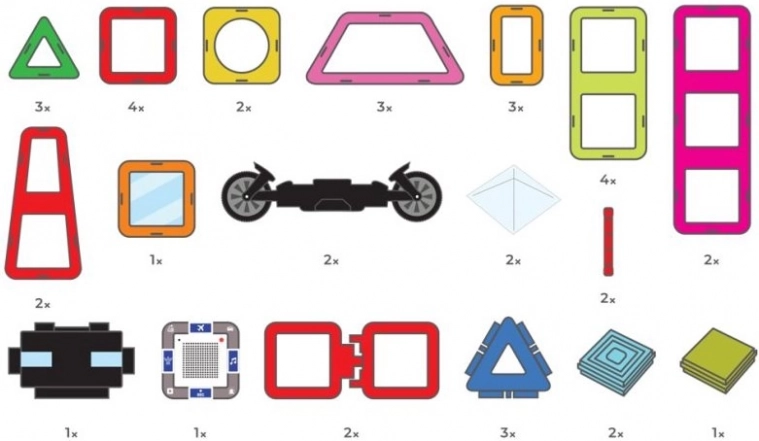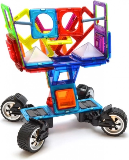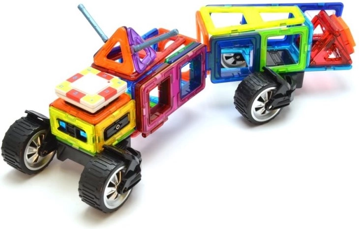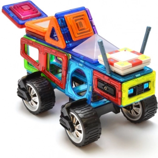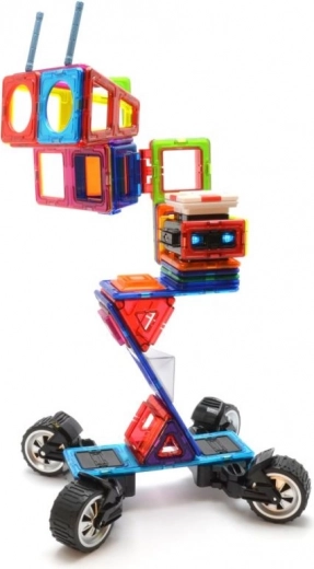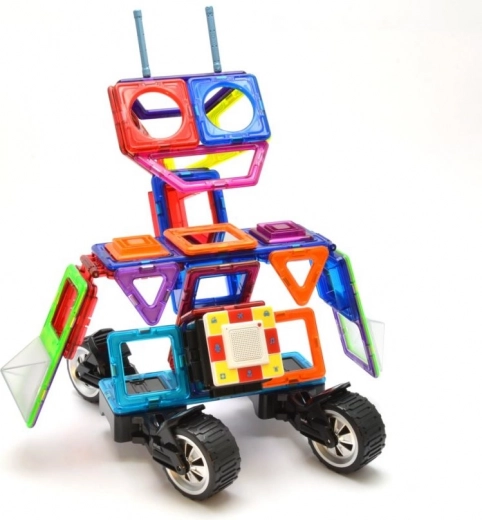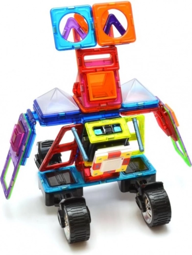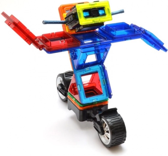 Cutia este ideală pentru construirea roboților mobili cu brațe reglabile liber, dar și a motocicletelor, camioanelor și remorcilor. Trei extensii triunghiulare și setul bogat de dreptunghiuri ajută la crearea unor cadre solide pe înălțime și lungime. Copiii vor experimenta conexiuni magnetice, își vor dezvolta imaginația, percepția spațială și motricitatea fină. Piesele sunt sigure, rezistente și compatibile cu GEOMAG.