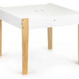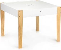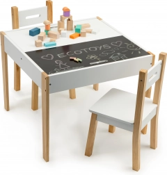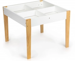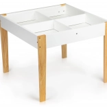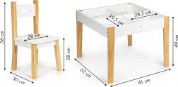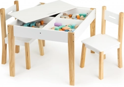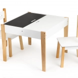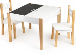 După terminarea jocului, toate jucăriile pot fi rapid organizate sub blatul de masă detașabil. Setul include două scaune confortabile cu picioare din lemn de pin.