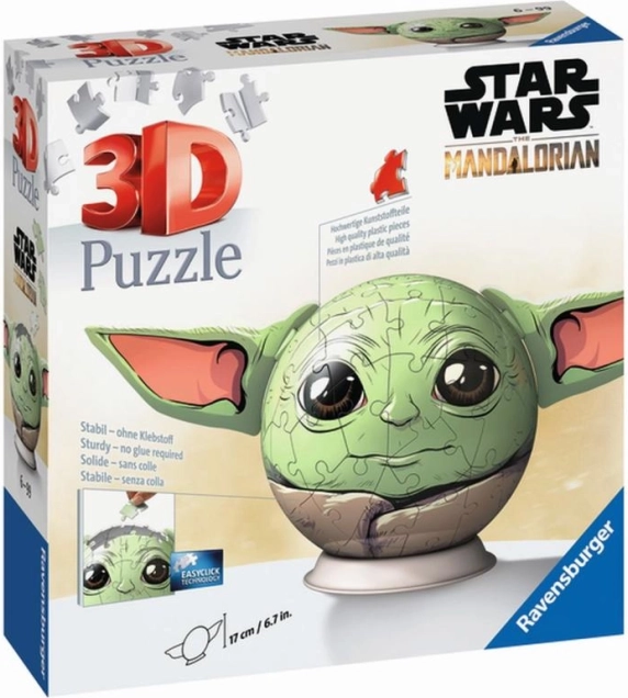 Descoperă distracția intergalactică cu puzzle-ul 3D Ravensburger STAR WARS Grogu – sferă din 72 de piese. Ideal pentru copii de la 6 ani. Datorită pieselor din plastic de înaltă calitate și sistemului de îmbinare precis, creezi un model 3D stabil fără lipici. Ambalajul compact este practic pentru depozitare și ca un cadou. Bucură-te de o provocare distractivă, construcție 3D și motivul îndrăgit Grogu.