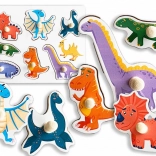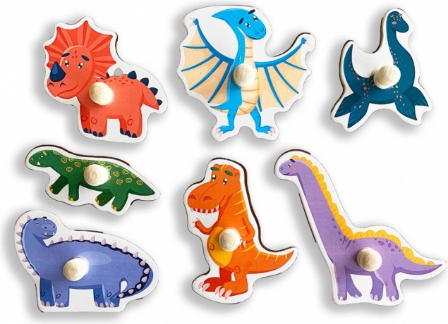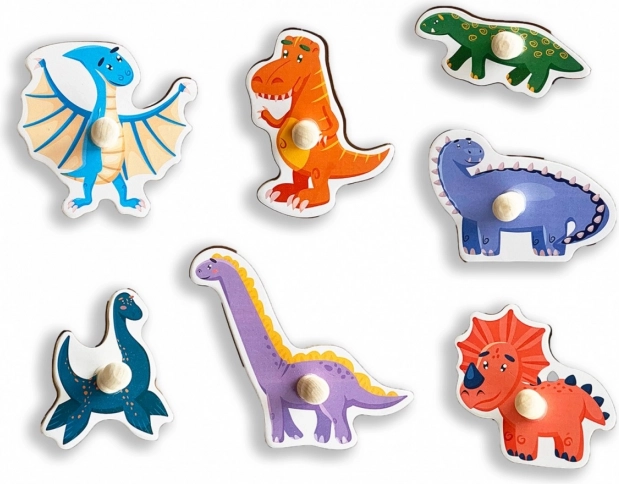 Puzzle colorat din lemn cu dinozauri pentru cei mici, care susține motricitatea fină, coordonarea mână–ochi și recunoașterea formelor și culorilor. Șapte piese cu mânere practice se introduc în decupajele frezate cu precizie din placă, facilitând manipularea și dezvoltând gândirea logică și memoria vizuală.
