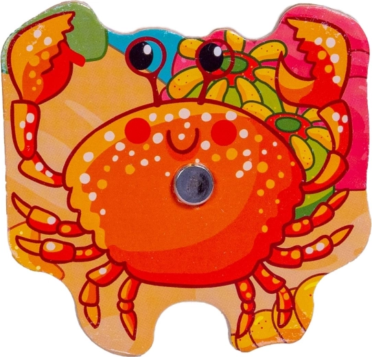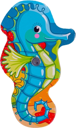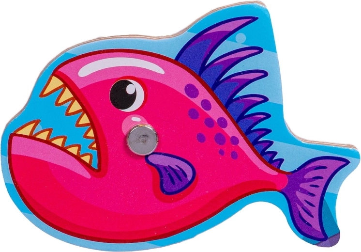 Joc distractiv și educativ pentru cei mici: puzzle magnetic din lemn cu tematică de animale marine și undiță. Datorită magnetului, copiii prind ușor peștișorii și îi așază în locurile corecte, dezvoltând astfel motricitatea fină, coordonarea mână–ochi, recunoașterea formelor și a culorilor și concentrarea. Grafica colorată și veselă le captează atenția și transformă învățarea în joacă.