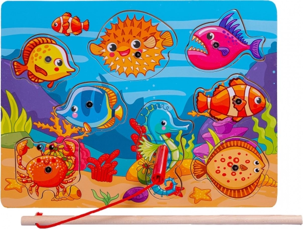 - Placă din lemn cu decupaje, piese din lemn – animale marine, undiță magnetică
