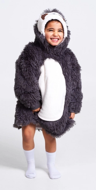 Pătură cu glugă cu motiv de leneș, care cu siguranță va încânta copiii cu aspectul său jucăuș.