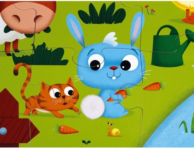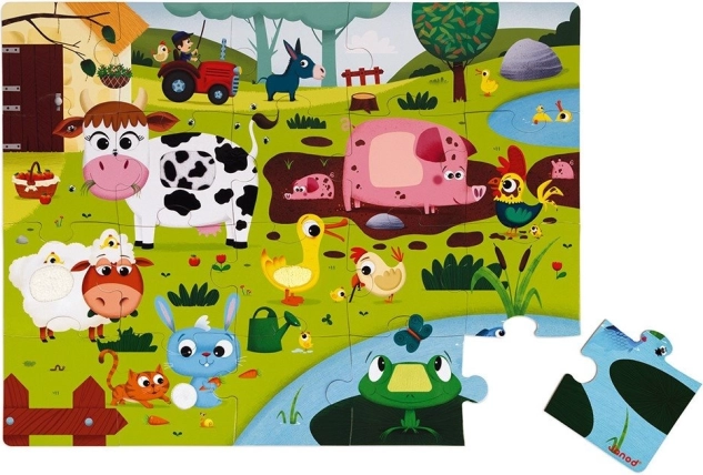 Puzzle pentru copii JANOD cu motivul animalelor de la fermă. Unele piese au o finisare specială – o textură caracteristică și pentru animalele reale. Puzzle-urile dezvoltă gândirea logică, atenția și memoria copiilor. Cu ajutorul puzzle-urilor, copiii învață să recunoască culorile, formele, obiectele, își dezvoltă motricitatea mâinilor și învață să perceapă relația dintre părți și întreg. Datorită pieselor speciale ale puzzle-ului, copiii învață prin atingere diferite texturi. Dimensiunea puzzle-ului asamblat este de aproximativ 65 x 50 cm
