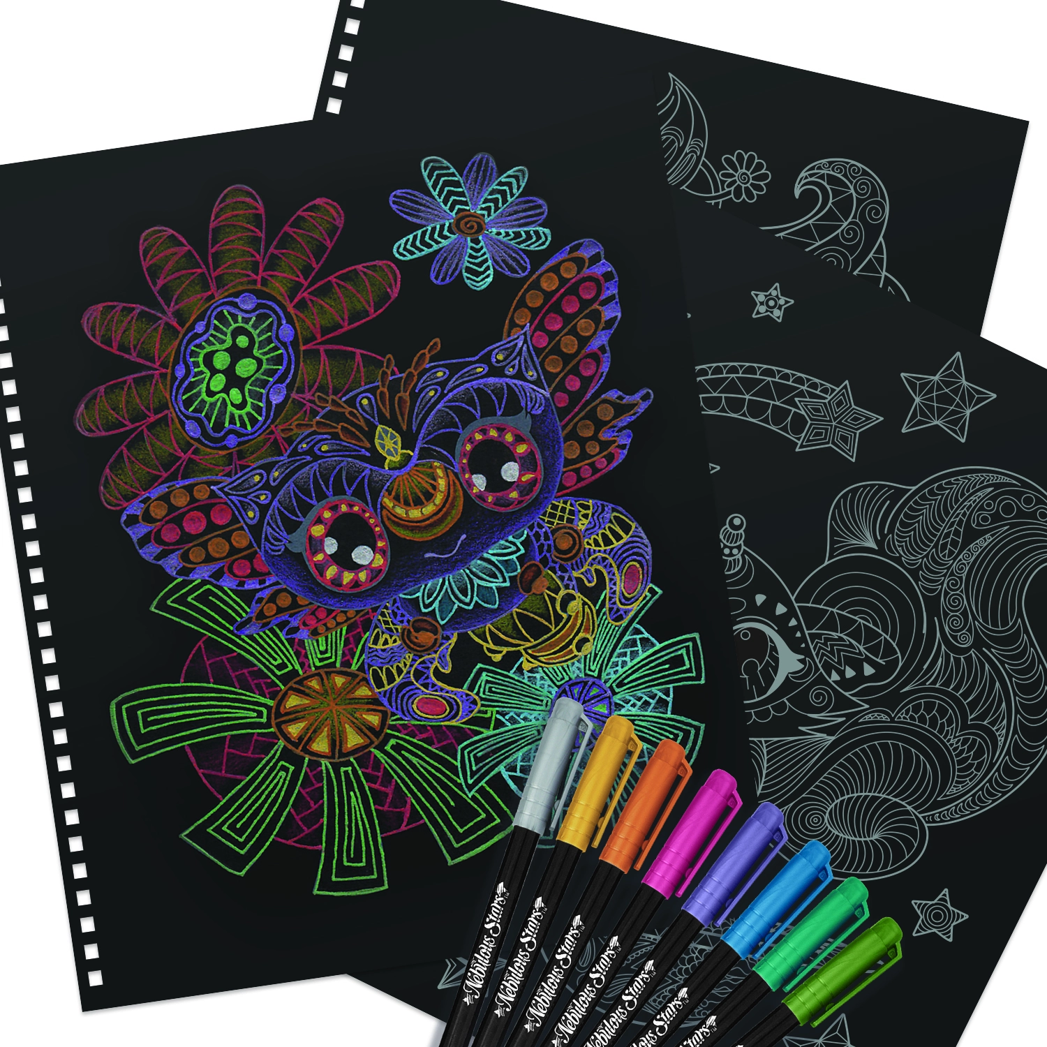 Setul include 8 markere gel metalice care se evidențiază superb pe paginile negre. Fiecare tușă accentuează detaliile și oferă desenelor un luciu elegant.