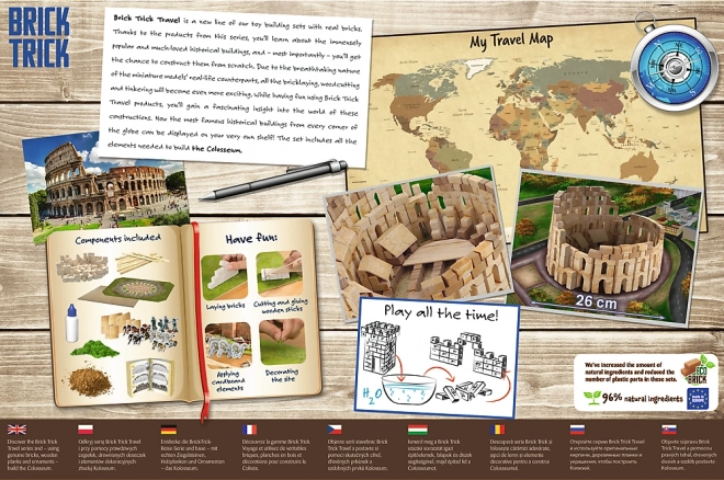 Descoperă atmosfera Romei antice și construiește propriul model al faimosului Colosseum. Setul TREFL BRICK TRICK Travel îmbină materiale autentice cu o formă de construcție distractivă și educativă. Pas cu pas, așezi cărămidă lângă cărămidă, tai și lipești elementele din lemn, iar rezultatul îl decorezi cu accesoriile incluse.