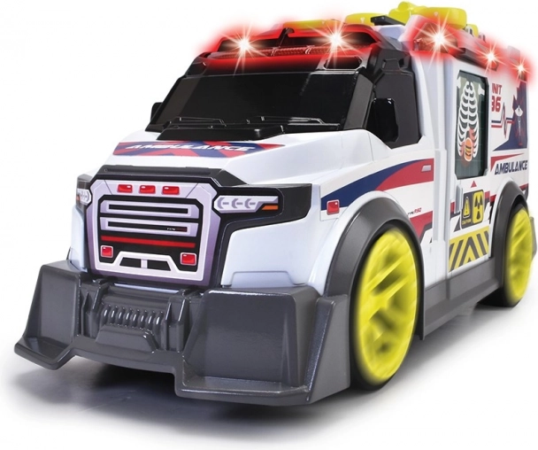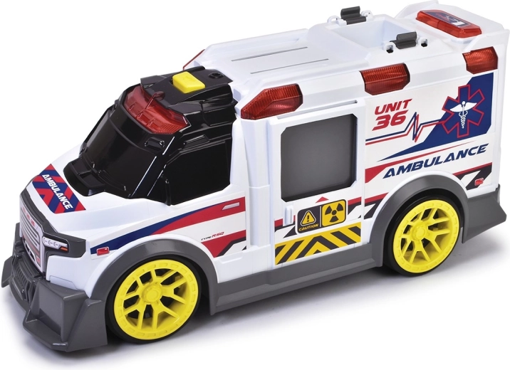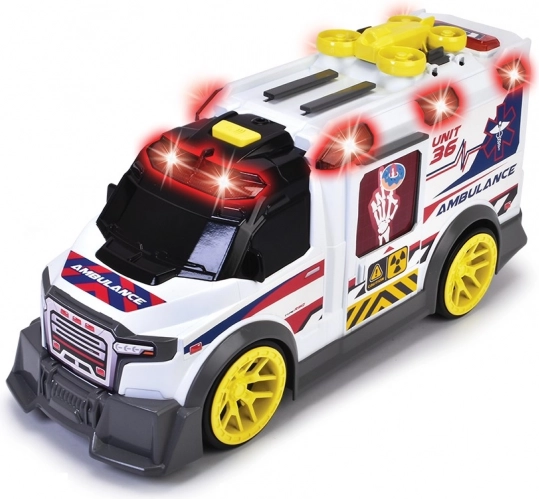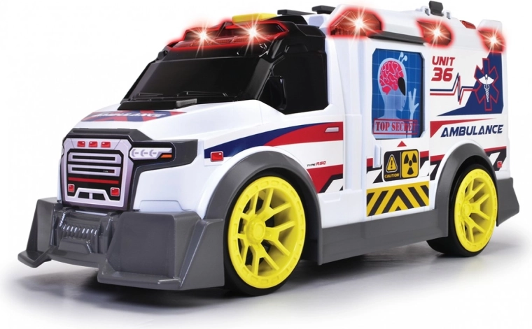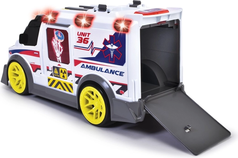 Vehicul de ambulanțăVehicul de ambulanță cu funcții de lumină și sunet. Vehiculul are piese care se pot deschide. Setul include aparat de radiografie, dronă detașabilă de pe acoperiș, targă și trusă medicală.
