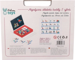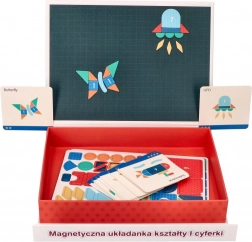 Descoperiți o jucărie educativă inteligentă care dezvoltă motricitatea fină, gândirea logică și imaginația. Copiii compun imagini din puzzle-uri magnetice – pătrate, triunghiuri, cercuri, romburi și alte forme, multe piese fiind marcate cu cifrele 1–9 pentru primii pași în matematică. Designul compact tip servietă cu mâner este ideal pentru distracție acasă și în călătorii.
