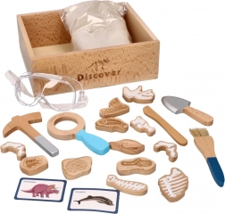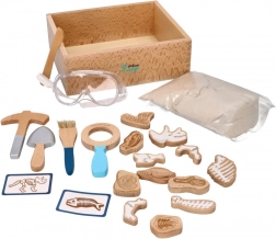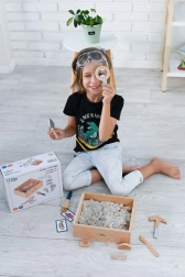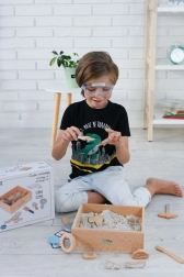Pachetul include tot ce are nevoie micul paleontolog: de la cufărul exploratorului la unelte (ciocănel, lupă, cuțitaș, pensulă, lopățică) până la oase de dinozaur, pești și fosile. Două carduri duble față-verso ajută la identificarea ușoară a descoperirilor excavate. Nisipul este produs în UE și respectă standardele de siguranță.