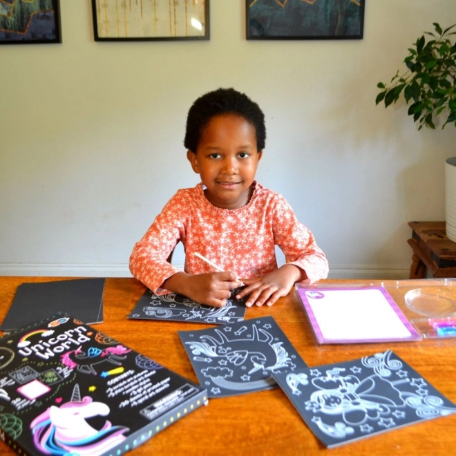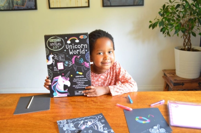 Acest set distractiv de artă cu motive de unicorni oferă ore întregi de creație pentru micii artiști. Copiii pot, cu ajutorul unui stylus din lemn, să dezvăluie straturi colorate pe cardurile de răzuire și să creeze propriile motive strălucitoare, sau pot încerca desenul spiral și să decoreze imaginile cu detalii colorate.
