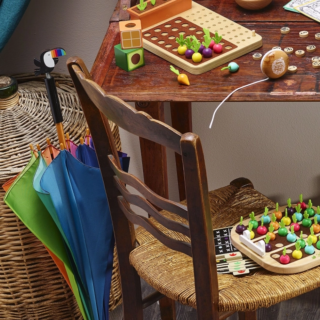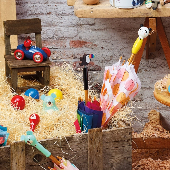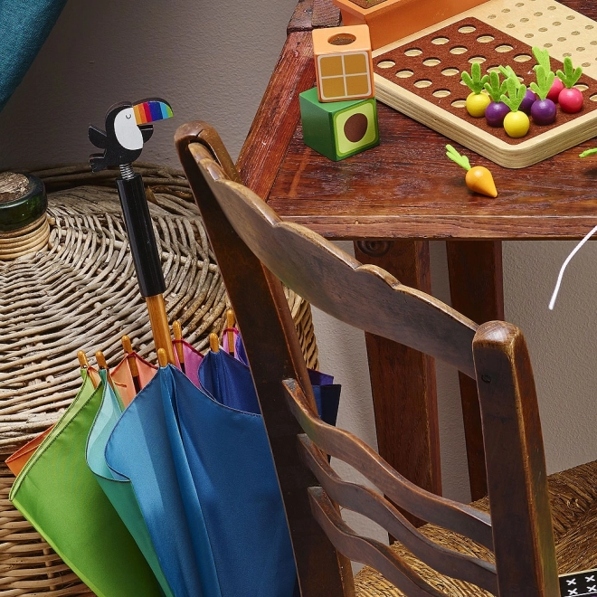 Această umbrelă colorată pentru copii transformă orice averse într-o aventură plină de bucurie. Panourile curcubeu și capătul iconic de tucan oferă un aspect jucăuș, în timp ce construcția robustă protejează de ploaie și vânt. Ideală pentru copii de la 3 ani.