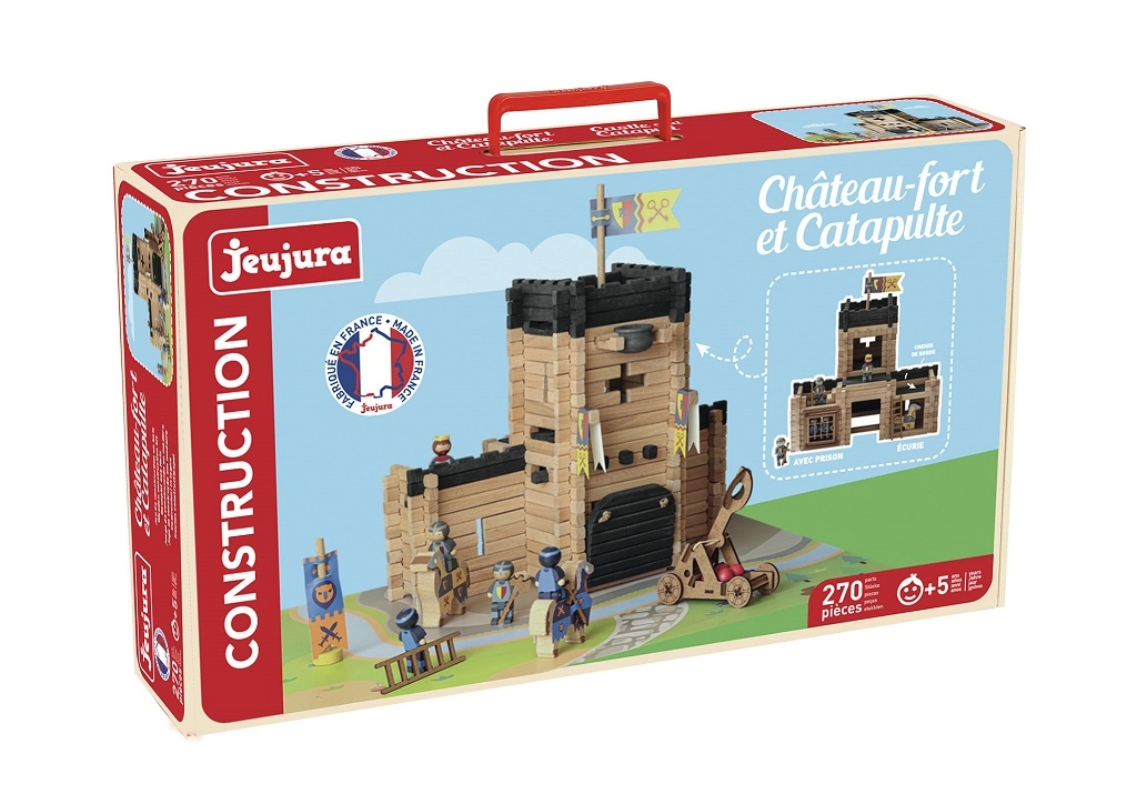 Construiește-ți propriul regat medieval cu setul de construcție din lemn JEUJURA. Setul cu 270 de piese din lemn masiv le permite copiilor să creeze un castel mare cu pod mobil, închisoare, pasarele de strajă, steaguri și o catapultă funcțională. Producție tradițională franceză, culori sigure pe bază de apă și ambalaj practic într-un geamantan din carton fac din acest set un cadou perfect pentru micii constructori de la 5 ani.