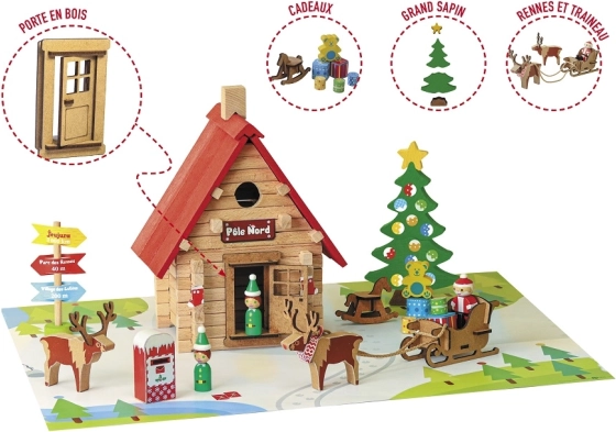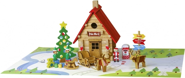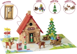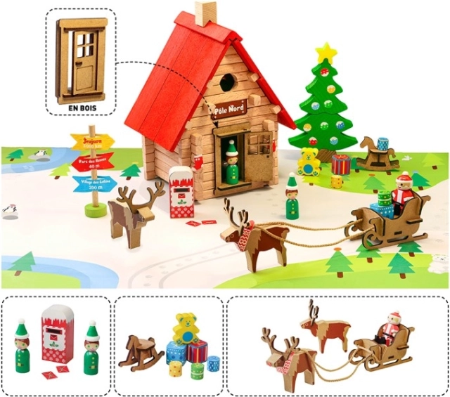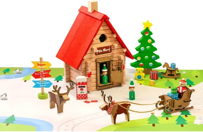 Acest set tematic aduce copiilor atmosfera Polului Nord direct în camera lor. Construiește căsuța lui Moș Crăciun, așază figurinele de spiriduși, înhamă renii la sanie și decorează spațiul cu bradul de Crăciun și cadouri. Datorită pieselor din lemn precis realizate, construcția este distractivă și dezvoltă motricitatea fină, răbdarea și creativitatea.