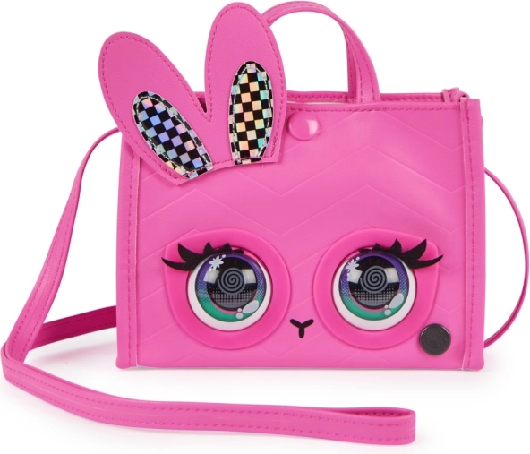 Exprimați-vă stilul cu simpatica geantă PURSE PETS Holly Hops, în design roz, cu ochi pop-art și urechiușe de iepuraș holografice. Geanta reacționează la atingere – prin clipit și sunete – și transformă orice ținută într-un show distractiv. Datorită modurilor inteligente, copiii se bucură de dans pe ritm și de concursul de privit fără să clipească.