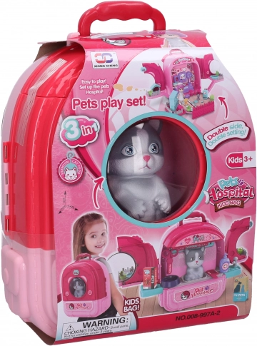 Spital pentru animăluțe în rucsac pentru pisici, complet cu figurină pisică și echipamente medicale pentru copii.