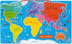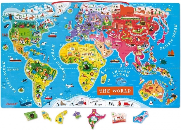 Această frumoasă hartă magnetică a lumii are dimensiunile de 77 x 46 x 1 cm și conține 92 de piese de puzzle din lemn. Fiecare piesă reprezintă o regiune sau o țară, poartă numele capitalei și include o imagine care caracterizează locul respectiv, cum ar fi clădiri importante, monumente, animale și plante. Harta este în limba engleză și poate fi agățată pe perete, devenind astfel un element unic în camera copilului.