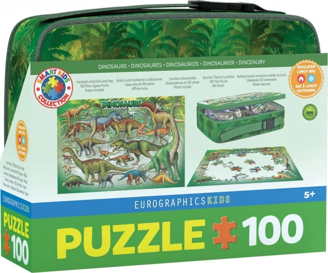 Cauți un cadou original pentru copii și adulți? Puzzle-ul EUROGRAPHICS cu motiv de dinozauri vine într-o practică cutie termo pentru gustare, care poate fi folosită și după finalizarea puzzle-ului. Datorită celor 100 de piese, este excelent pentru antrenarea concentrației, a motricității fine și a imaginației spațiale.