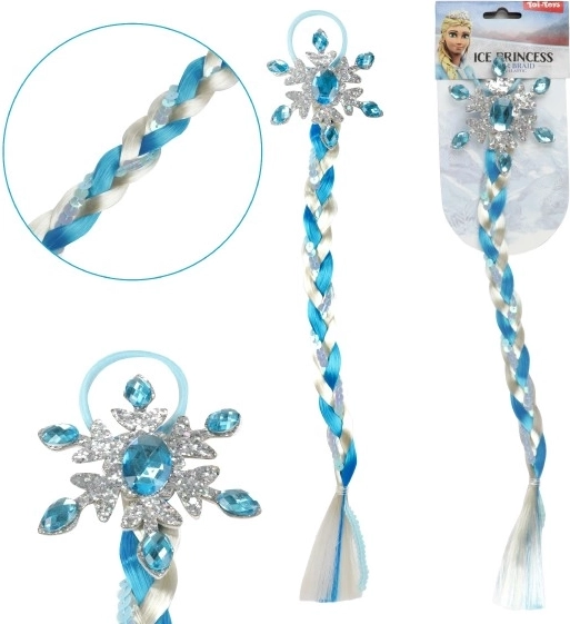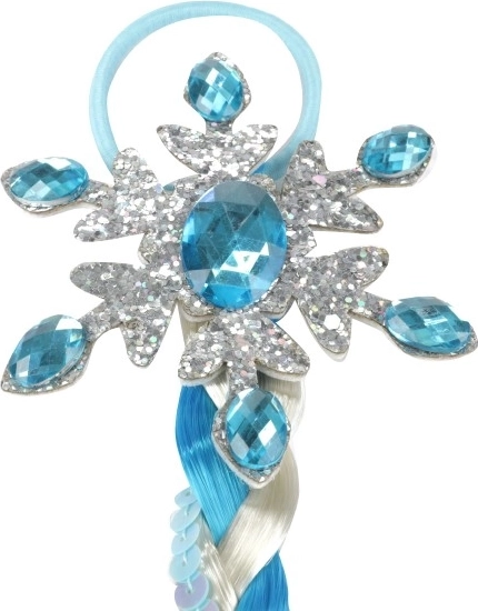 Părul fals Prințesă de Gheață este creat din șuvițe albastre-albe, decorat cu fulgi de zăpadă tematici și sclipici. Este ușor de atașat datorită elasticului, asigurând o purtare confortabilă.
