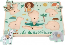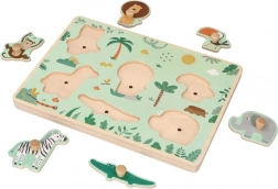 Această jucărie susține coordonarea și precizia mișcărilor micilor mânuțe datorită mânerelelor de pe fiecare piesă din lemn. Copiii învață să deosebească și să asocieze forme și trăsături principale ale animalelor, precum și să își mărească cunoștințele despre diversitatea faunei mondiale. Ideal pentru învățare interactivă și distracție, care sustine creativitatea copilului.