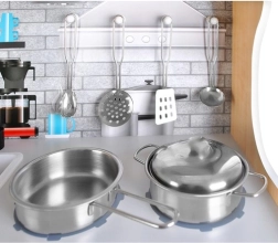 Bucătăria este realizată din lemn de calitate, fiind stabilă, durabilă și sigură. Setul include accesorii metalice bogate – oală, tigaie, capac și 4 ustensile de bucătărie – și o chiuvetă detașabilă pentru „spălarea” ușoară a vaselor. Designul și culorile neutre sunt potrivite atât pentru fete, cât și pentru băieți.