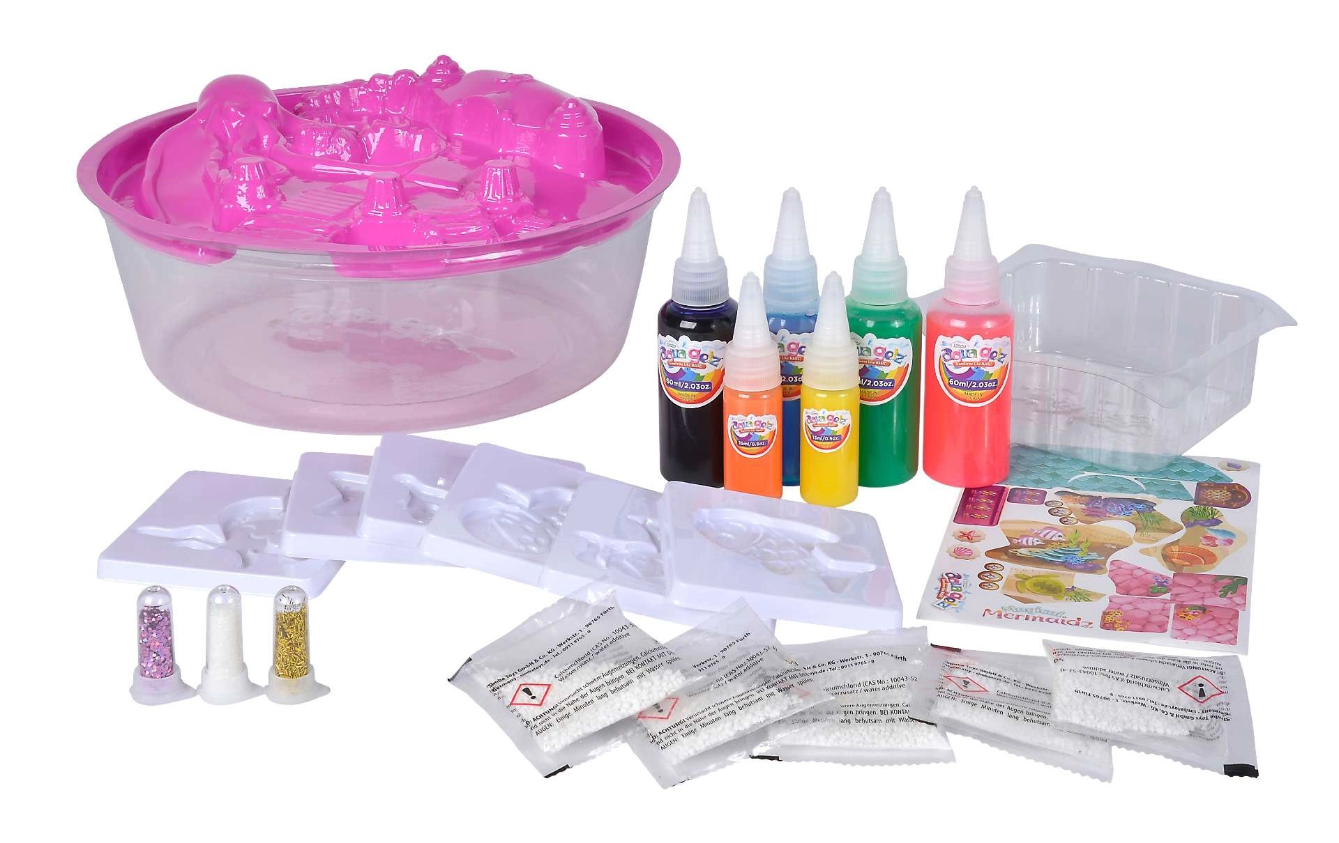 - 2 × 15 ml gel colorat, 4 × 60 ml gel colorat, 3 × sclipici, 6 × mulaj, 5 × 5 g pulbere pentru pregătirea soluției, instrucțiuni